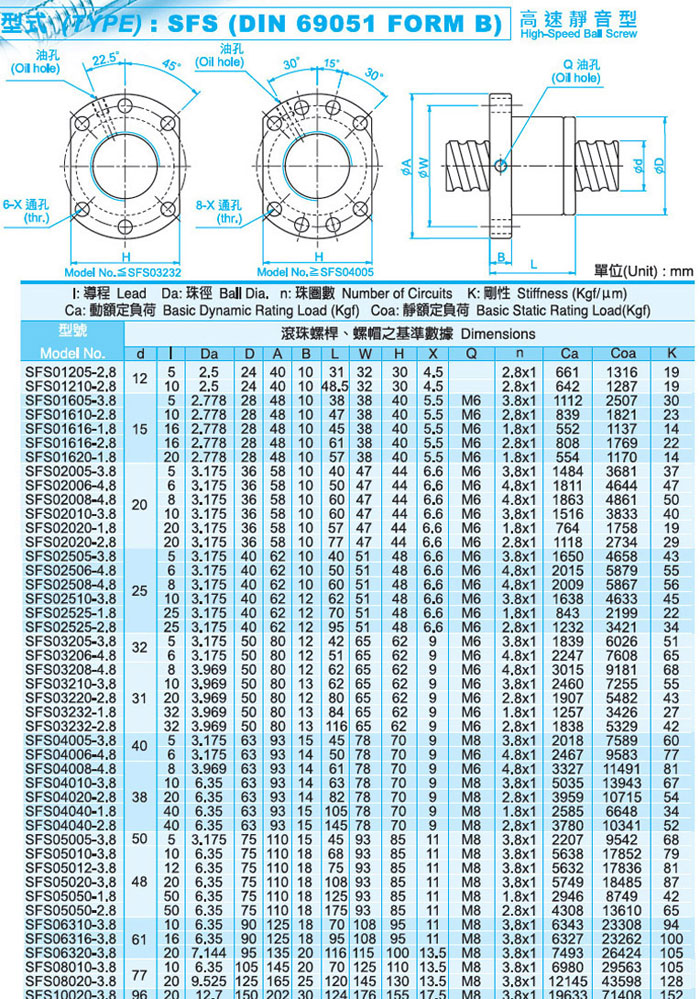 高速型TBI滾珠絲桿SFS系列型號齊全,參數(shù)如下: