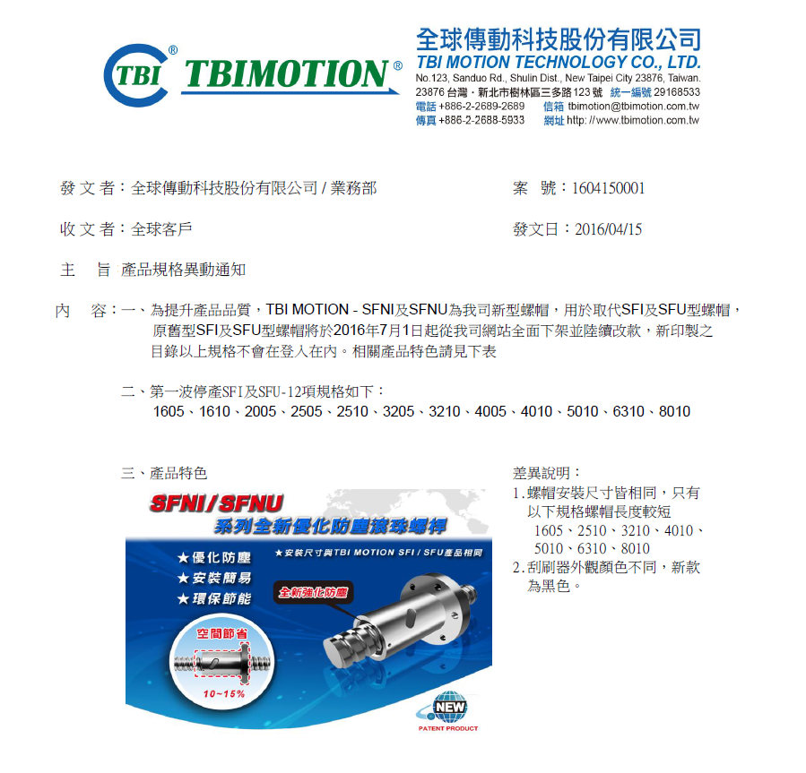 TBI絲杠為提升產品品質,特對螺母工藝進行技術改良,TBI MOTION SFNU為TBI新型螺帽,用于取代TBI絲杠SFU型螺帽,原型號SFU型螺帽將于2016年7月1日起全面停產并陸續改新款制造,新目錄資料請聯系我司業務獲取,感謝您的支持。