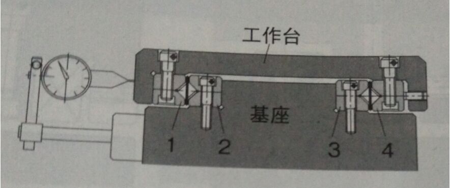 (4)如圖1所示,在交叉滾子導軌上設置千分表。然后輕輕地把左右工作臺從一邊推到另一邊,同時輕輕地擰緊所有的調節螺栓,直到左右之間沒有間隙為止。